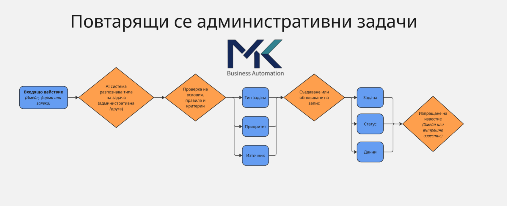 MK Business Automation помага на малки и средни бизнеси и компании да намалят ръчната работа, грешките и оперативния хаос чрез надеждни бизнес автоматизации